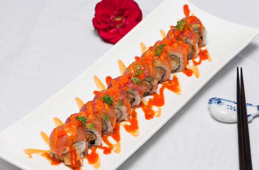 Crab and shrimp tempura on the inside and topped with tuna, salmon, avocado, spicy creamy sauce and unagi sauce.