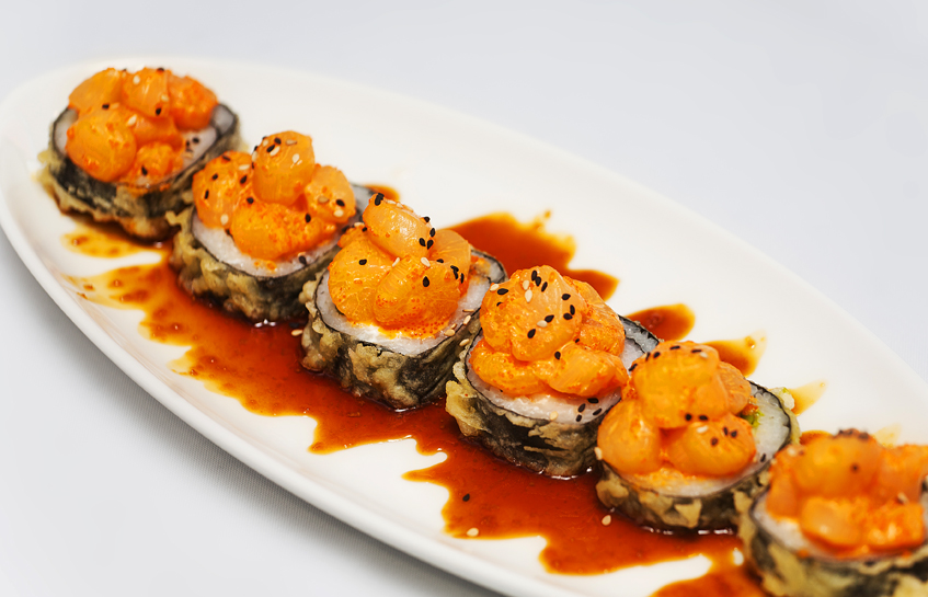 Tuna, salmon, albacore, avocado, and cream cheese deep fried then topped with spicy scallop and garlic unagi sauce.