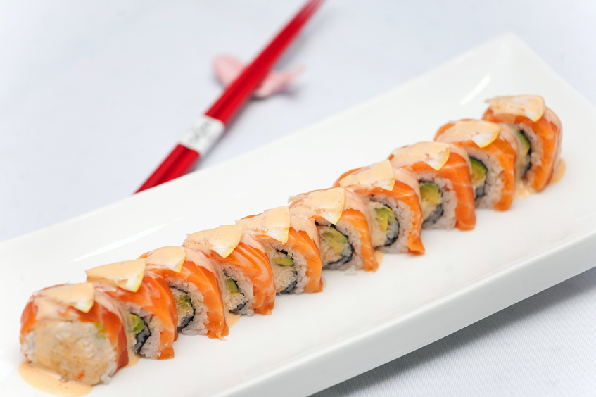 Crab and avocado on the inside and topped with fresh salmon, lemon and creamy sour sauce.