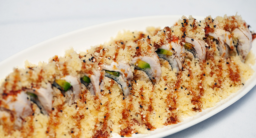 Shrimp tempura and crab on the inside and topped with albacore, avocado and Sriracha sauce seared outside with crunch and garlic unagi sauce.
