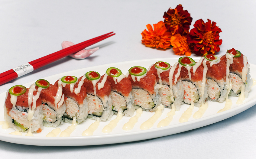 Crab, avocado and cucumber on the inside and topped with spicy tuna, serrano pepper and house creamy sauce.