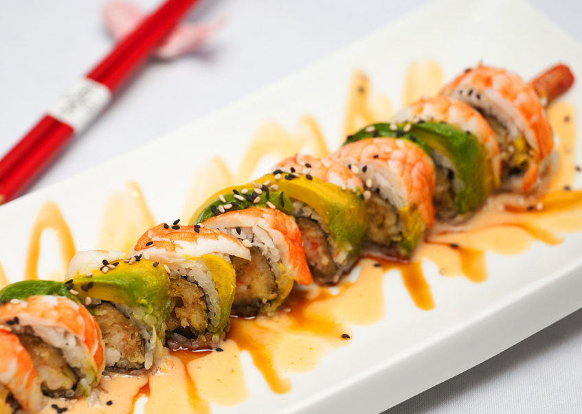 Shrimp tempura, crab and cucumber on the inside and topped with shrimp, avocado and unagi sauce.